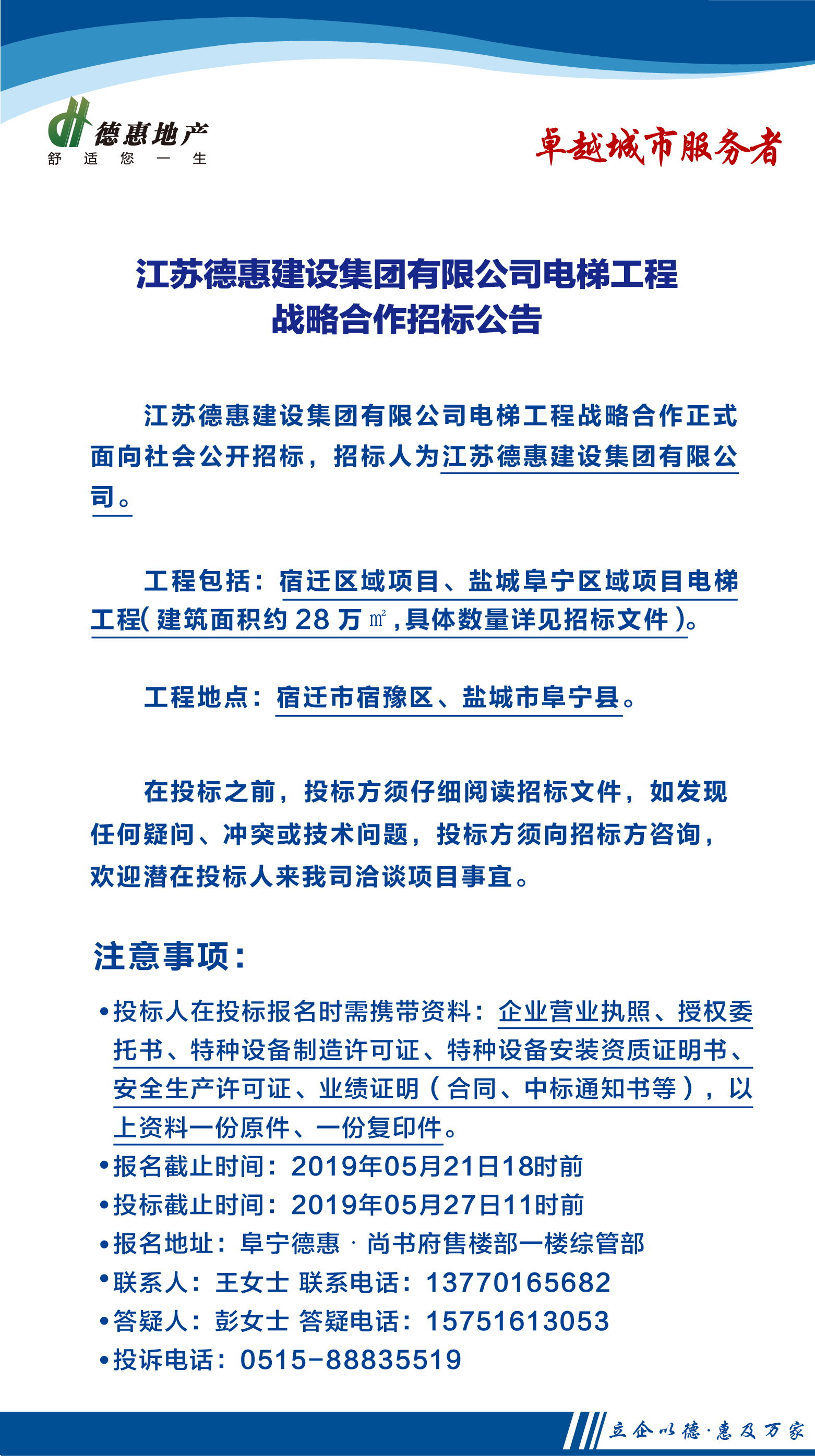 江蘇德惠建設(shè)集團(tuán)有限公司電梯工程戰(zhàn)略合作招標(biāo)公告