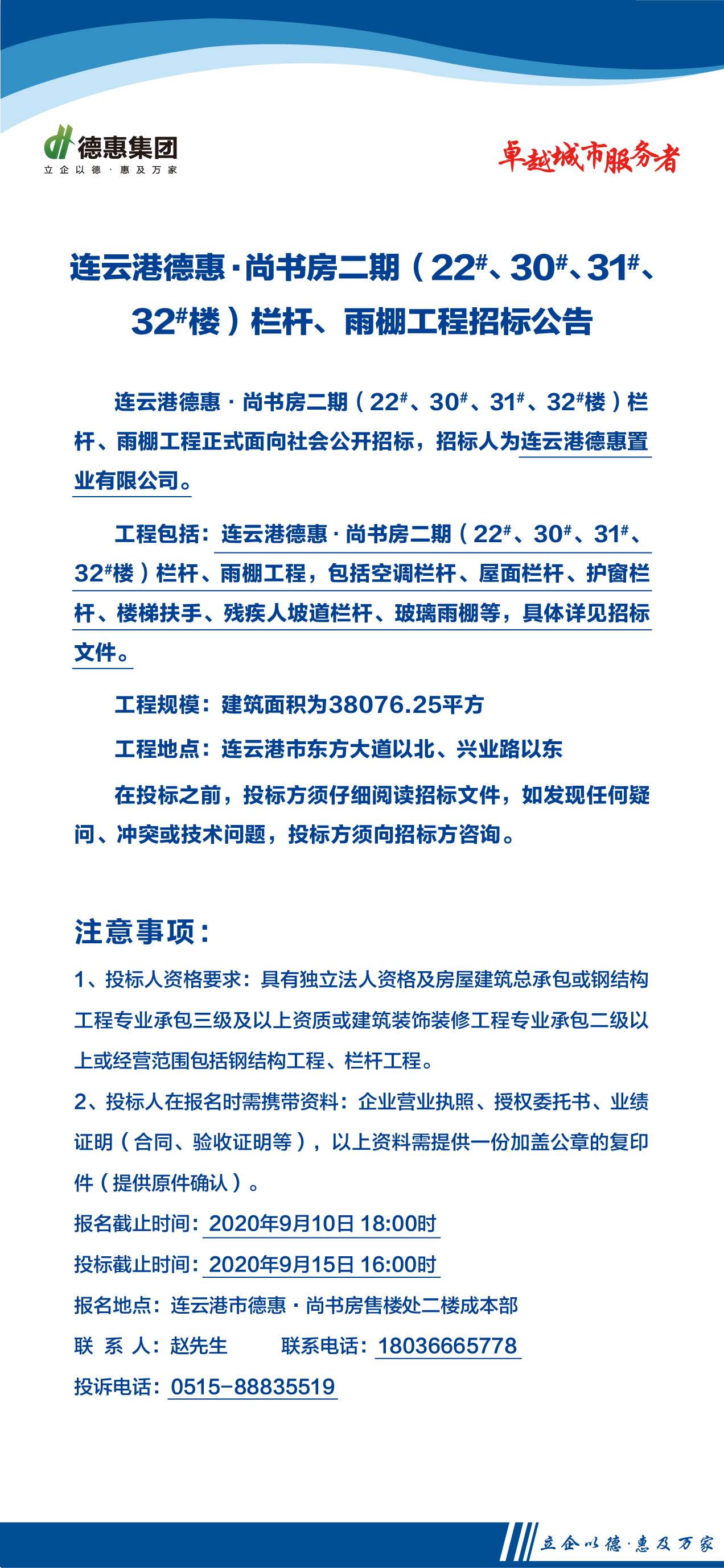 連云港德惠尚書房二期(22#、30#、31#、32#)欄桿、雨棚工程招標(biāo)公告