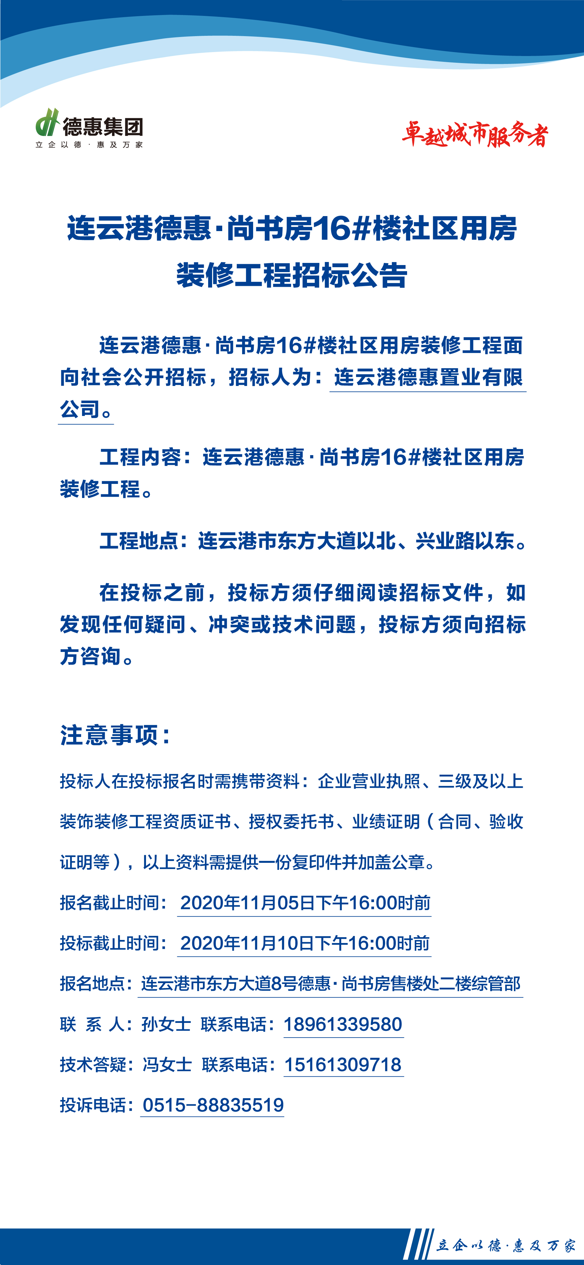 連云港德惠·尚書房16#樓社區(qū)用房裝修工程招標公告
