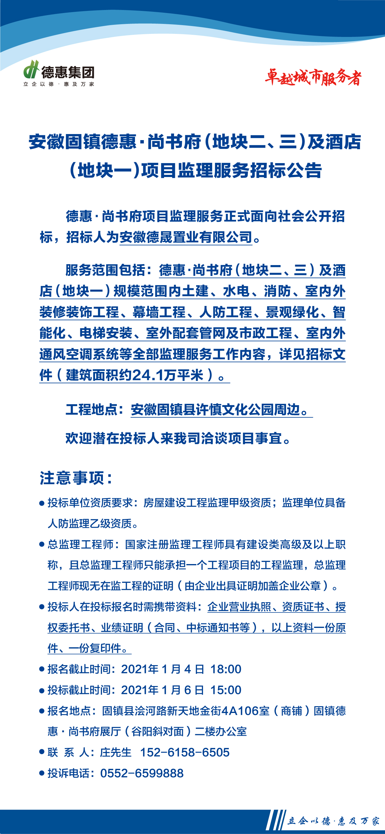 安徽固鎮(zhèn)德惠·尚書府(地塊二、三)及酒店(地塊一)監(jiān)理服務(wù)項目招標(biāo)公告