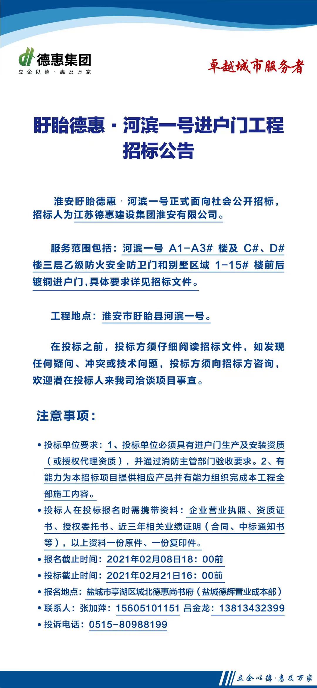 盱眙德惠·河濱一號進戶門工程招標(biāo)公告