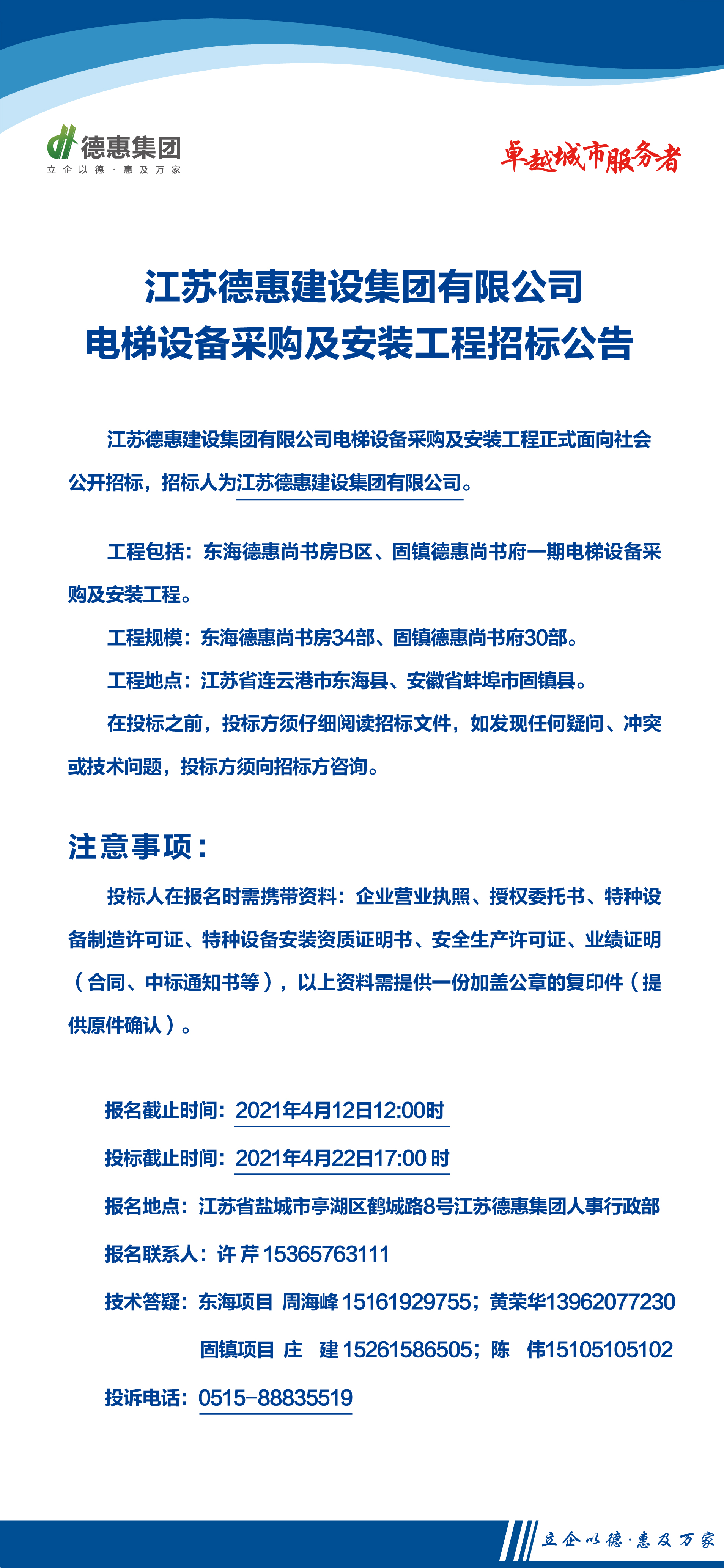 江蘇德惠建設(shè)集團有限公司電梯采購及安裝工程招標(biāo)公告