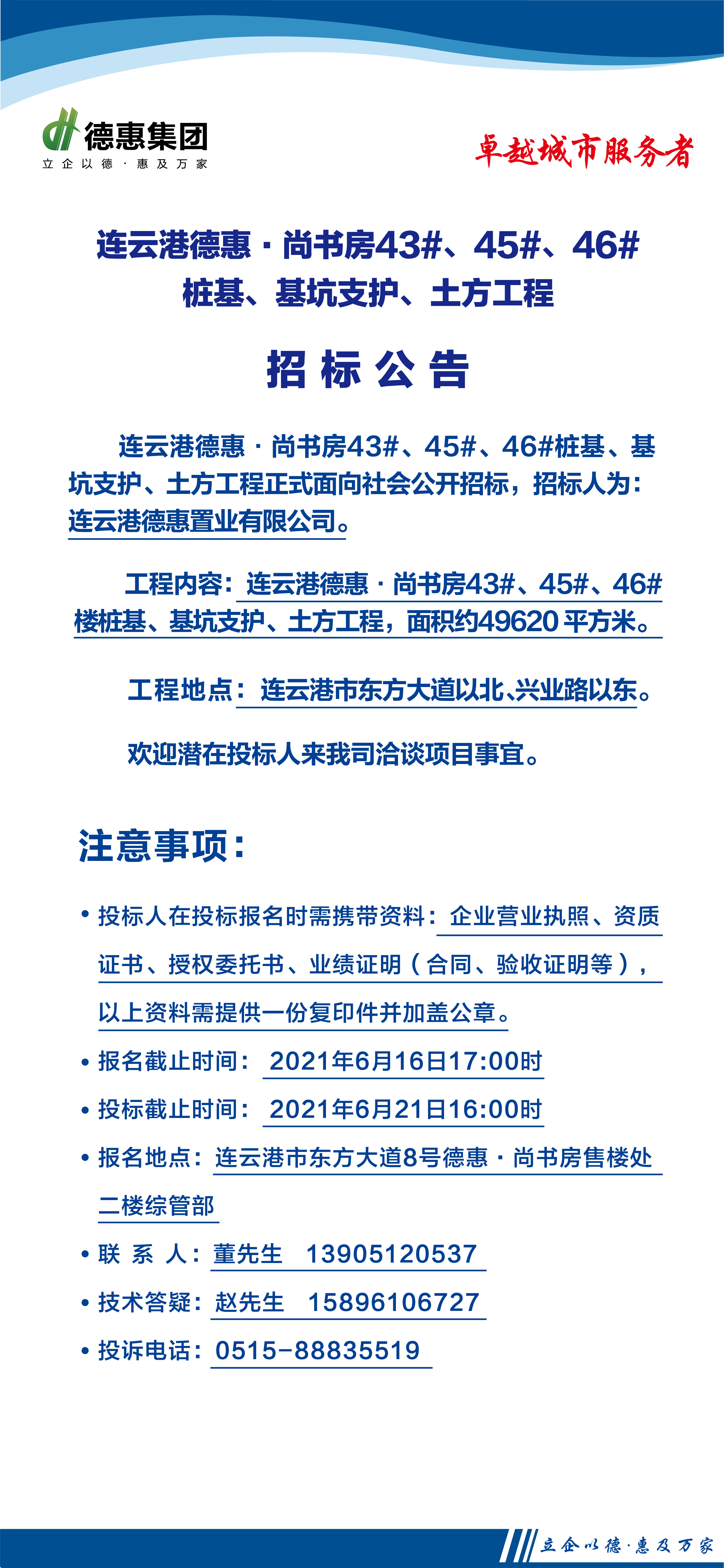 連云港德惠尚書(shū)房43#、45#、46#樓樁基、基坑支護(hù)、土方工程招標(biāo)公告