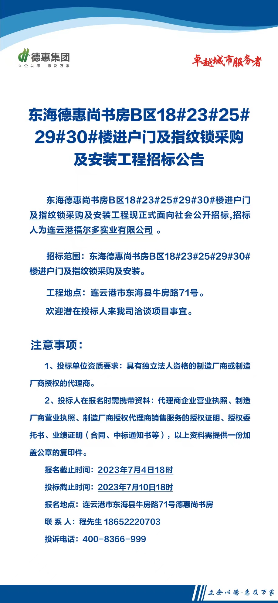 東海德惠尚書房B區(qū)18#23#25#29#30#樓進戶門及指紋鎖采購及安裝工程