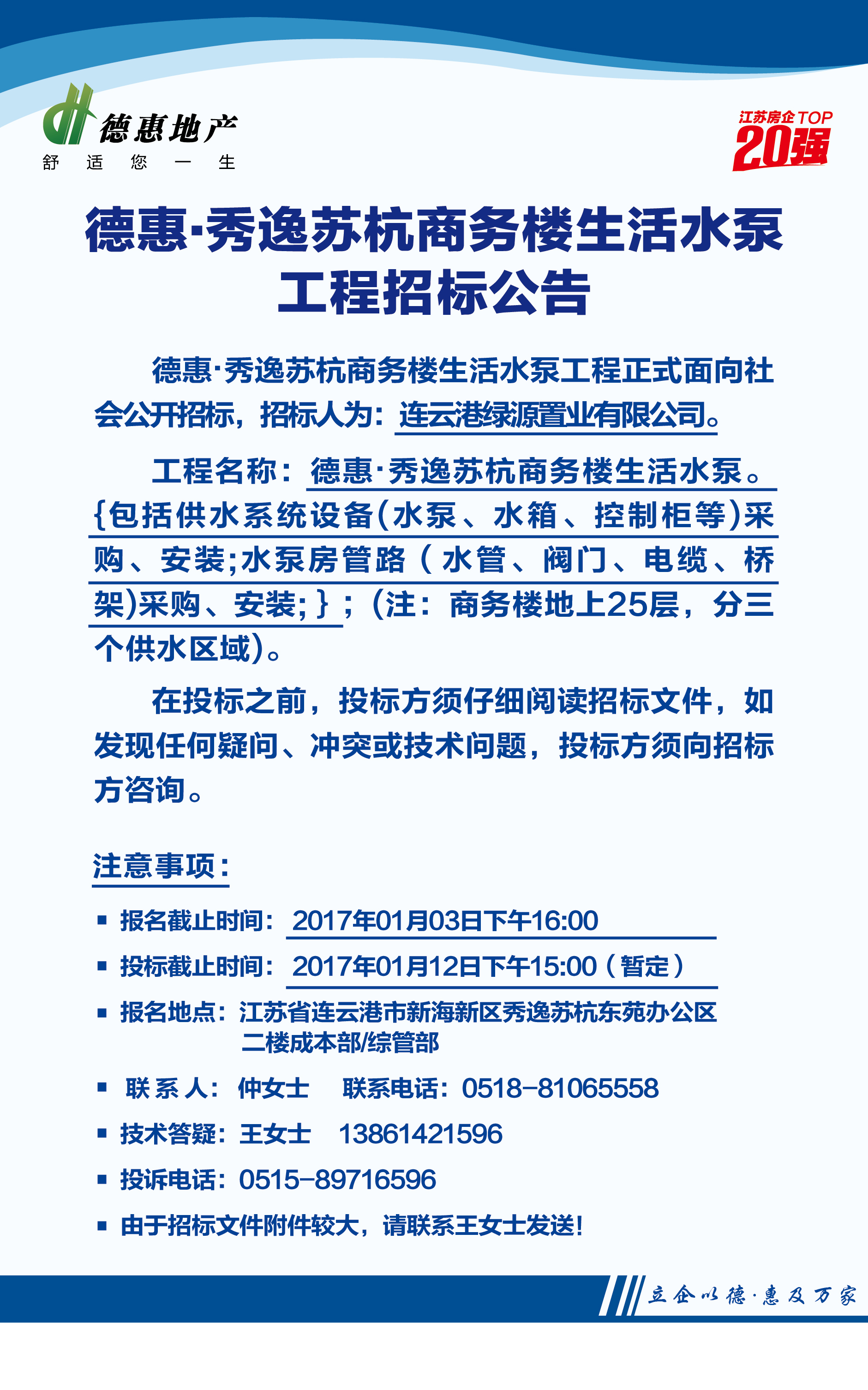 德惠•秀逸蘇杭商務(wù)樓生活水泵工程招標(biāo)公告及文件