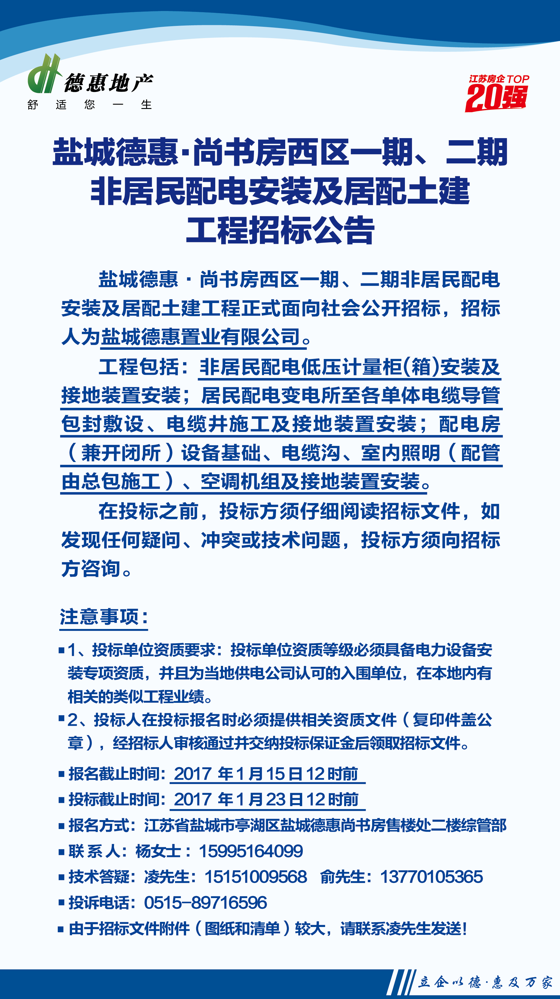 鹽城德惠尚書房西區(qū)一期、二期非居民配電安裝及居配土建工程招標(biāo)公告