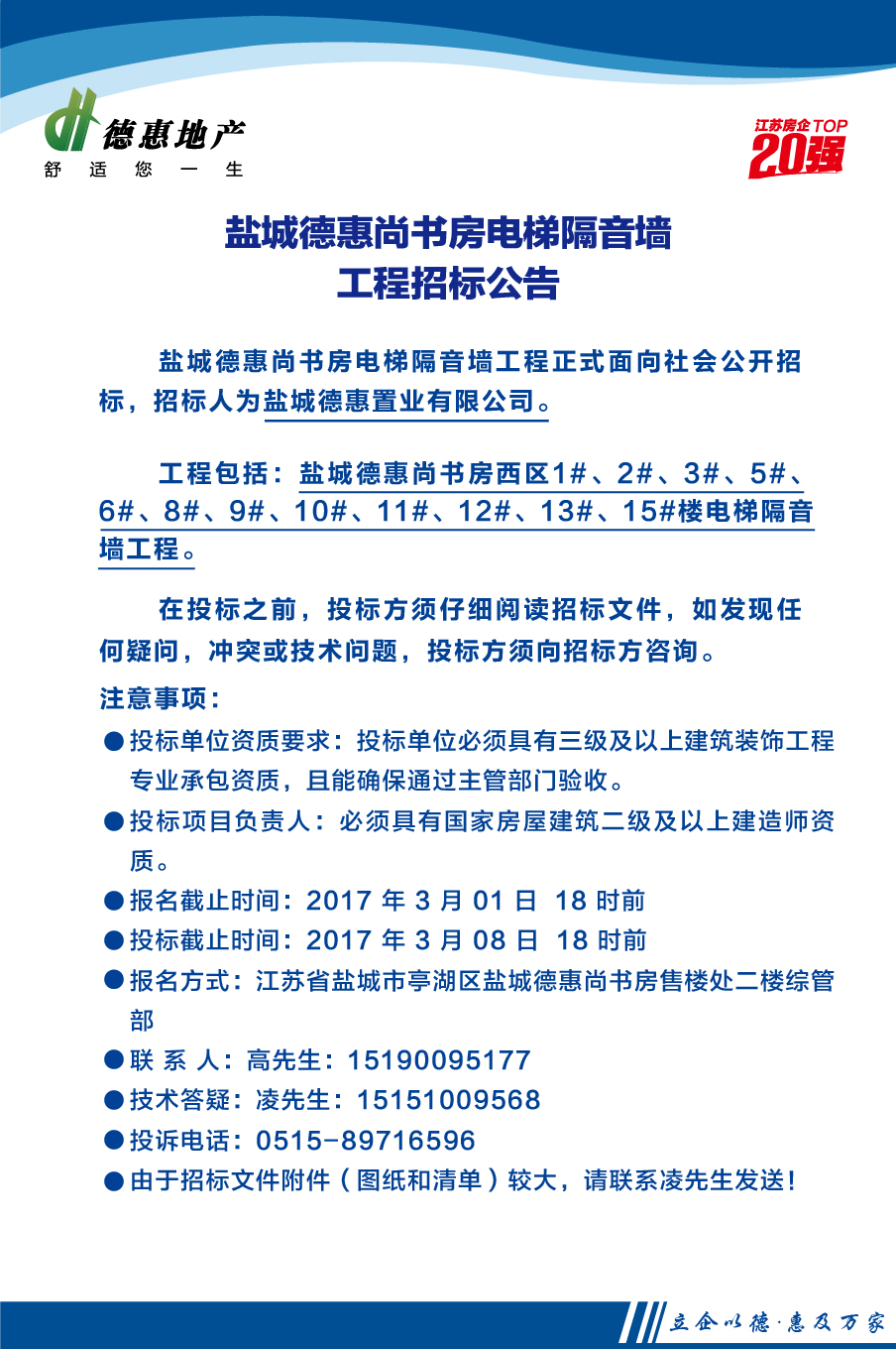 鹽城德惠尚書房西區(qū)電梯隔音墻工程招標公告