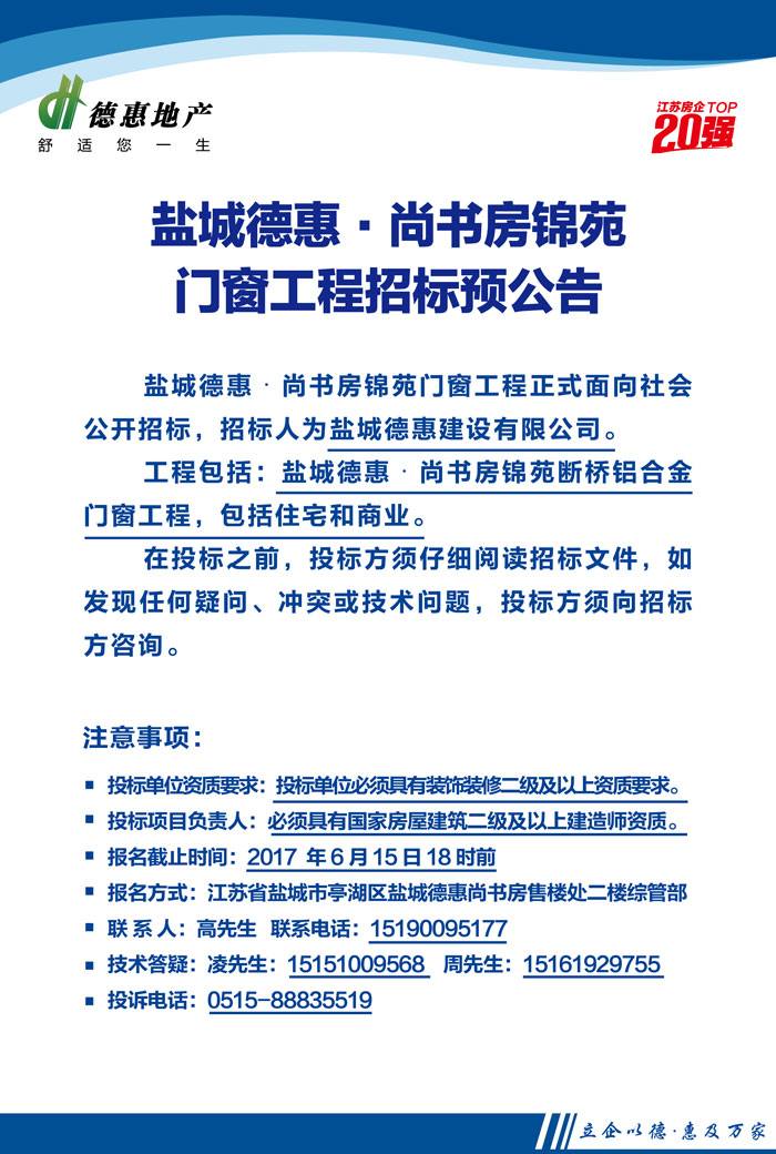 鹽城德惠•尚書房錦苑門窗工程招標預公告