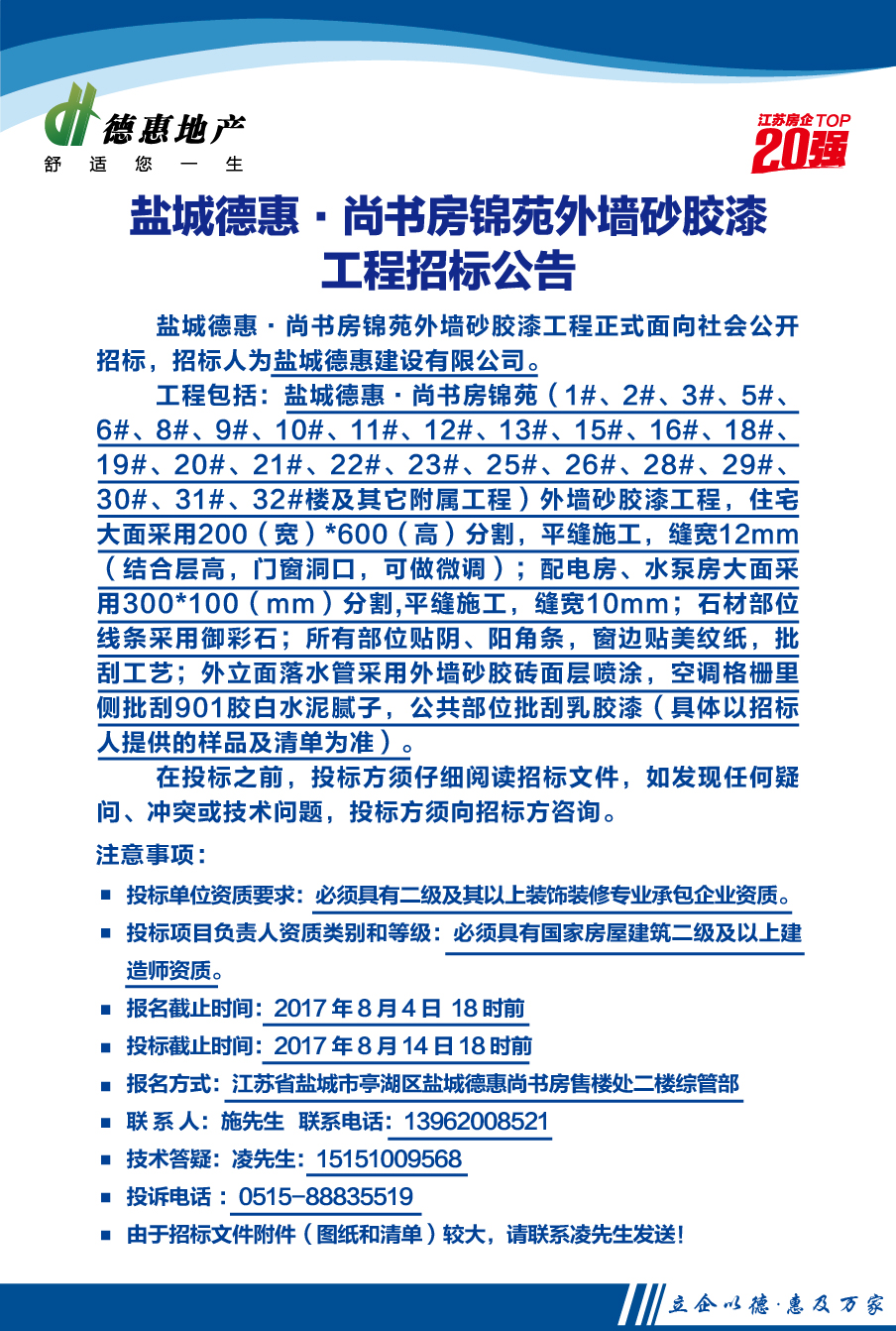 鹽城德惠•尚書(shū)房錦苑外墻砂膠漆工程招標(biāo)公告
