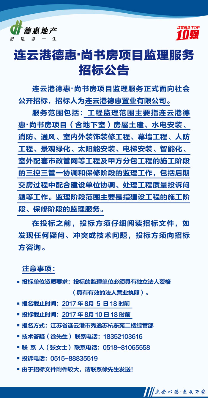 連云港德惠·尚書房項目監(jiān)理服務(wù)招標(biāo)公告