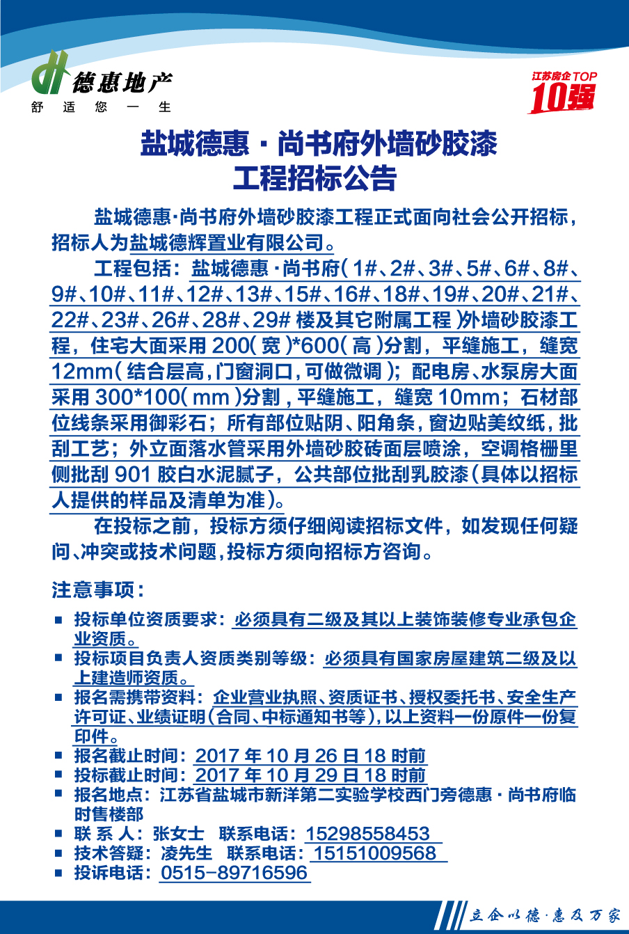 鹽城德惠·尚書府外墻砂膠漆工程招標(biāo)公告