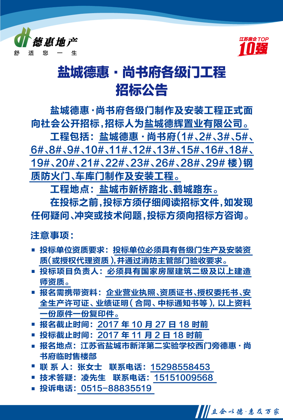 鹽城德惠·尚書府售樓處、樣板房精裝修工程招標公告