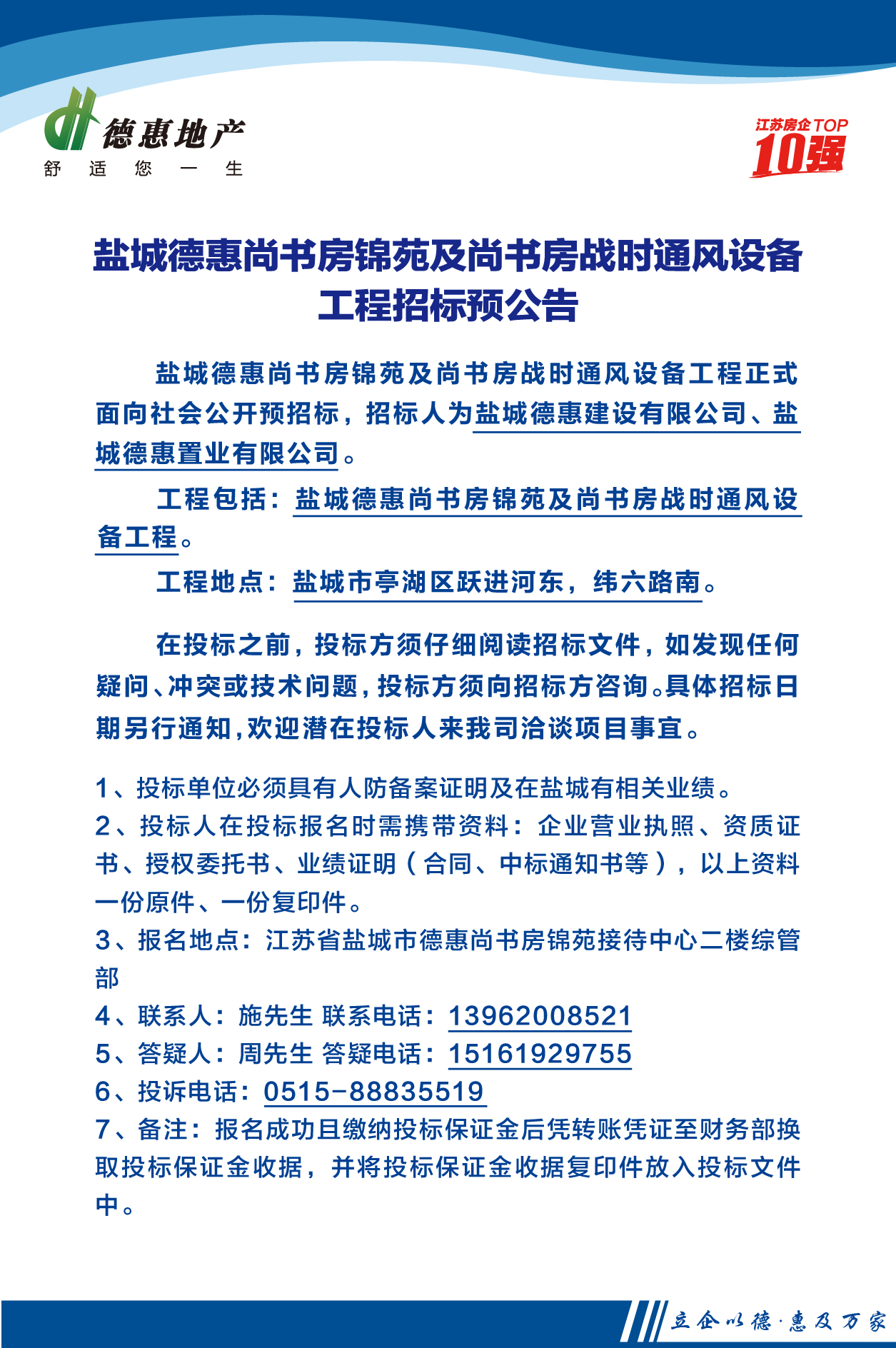 鹽城德惠·尚書(shū)房錦苑及尚書(shū)房戰(zhàn)時(shí)通風(fēng)設(shè)備工程招標(biāo)公告