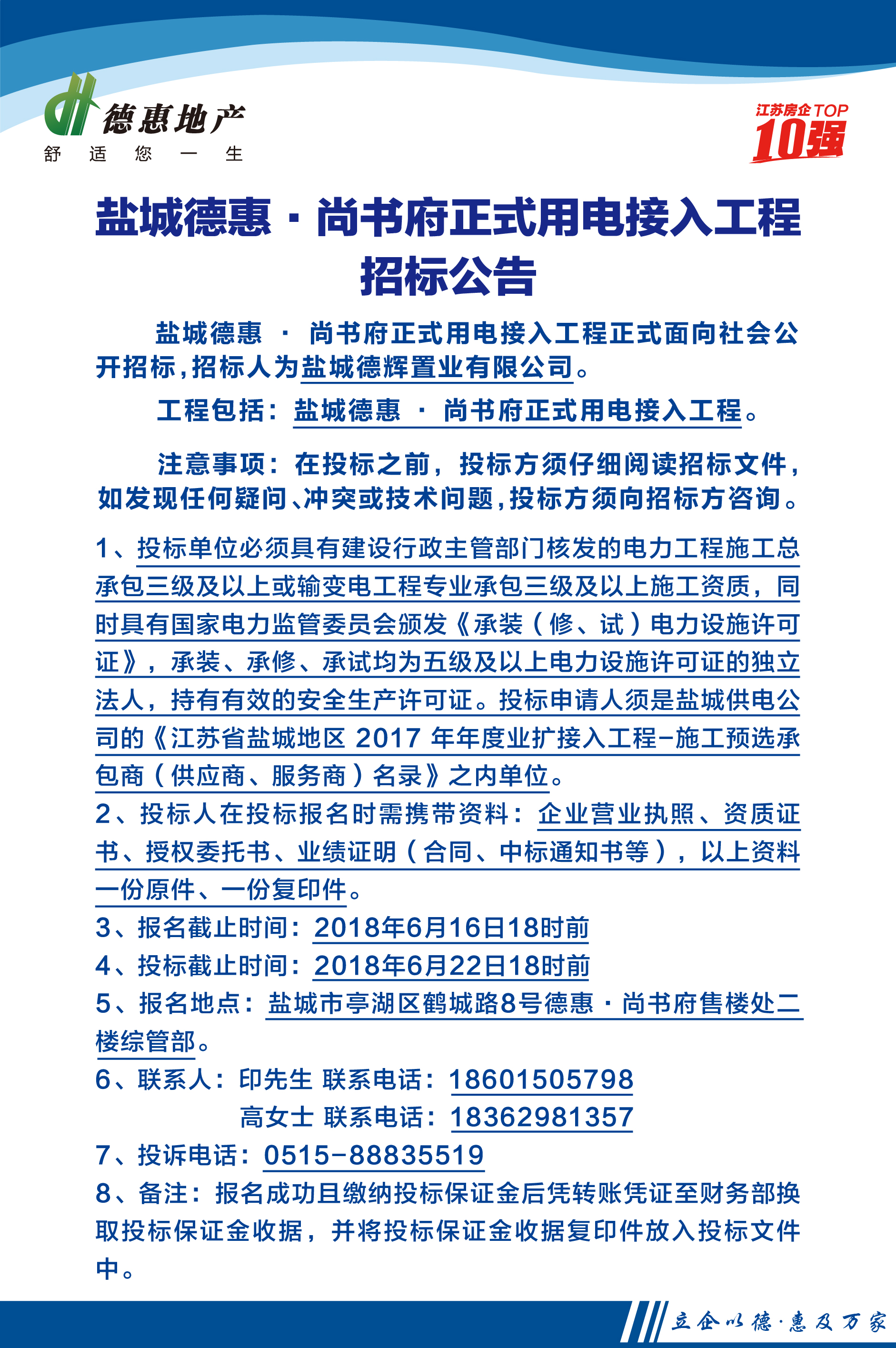 鹽城德惠·尚書府正式用電接入工程招標(biāo)公告