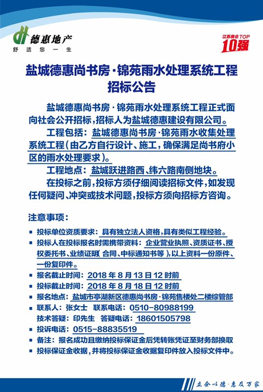 鹽城德惠尚書(shū)房•錦苑雨水處理系統(tǒng)工程招標(biāo)公告