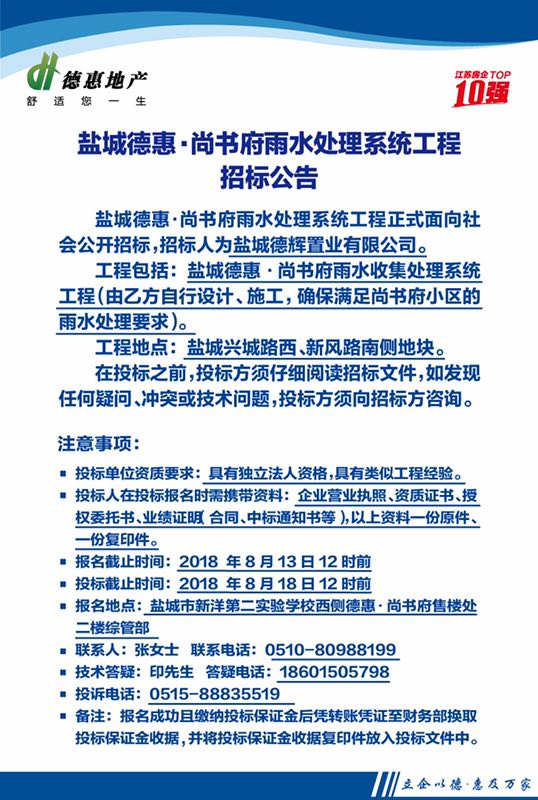 鹽城德惠·尚書府雨水處理系統工程招標公告