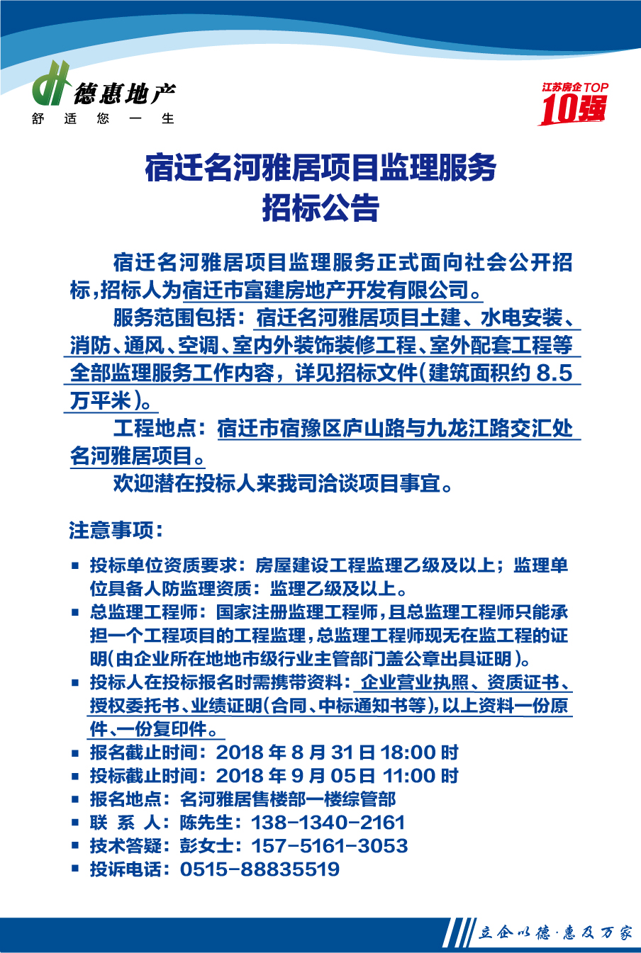 宿遷名河雅居項目監(jiān)理服務(wù)招標(biāo)公告