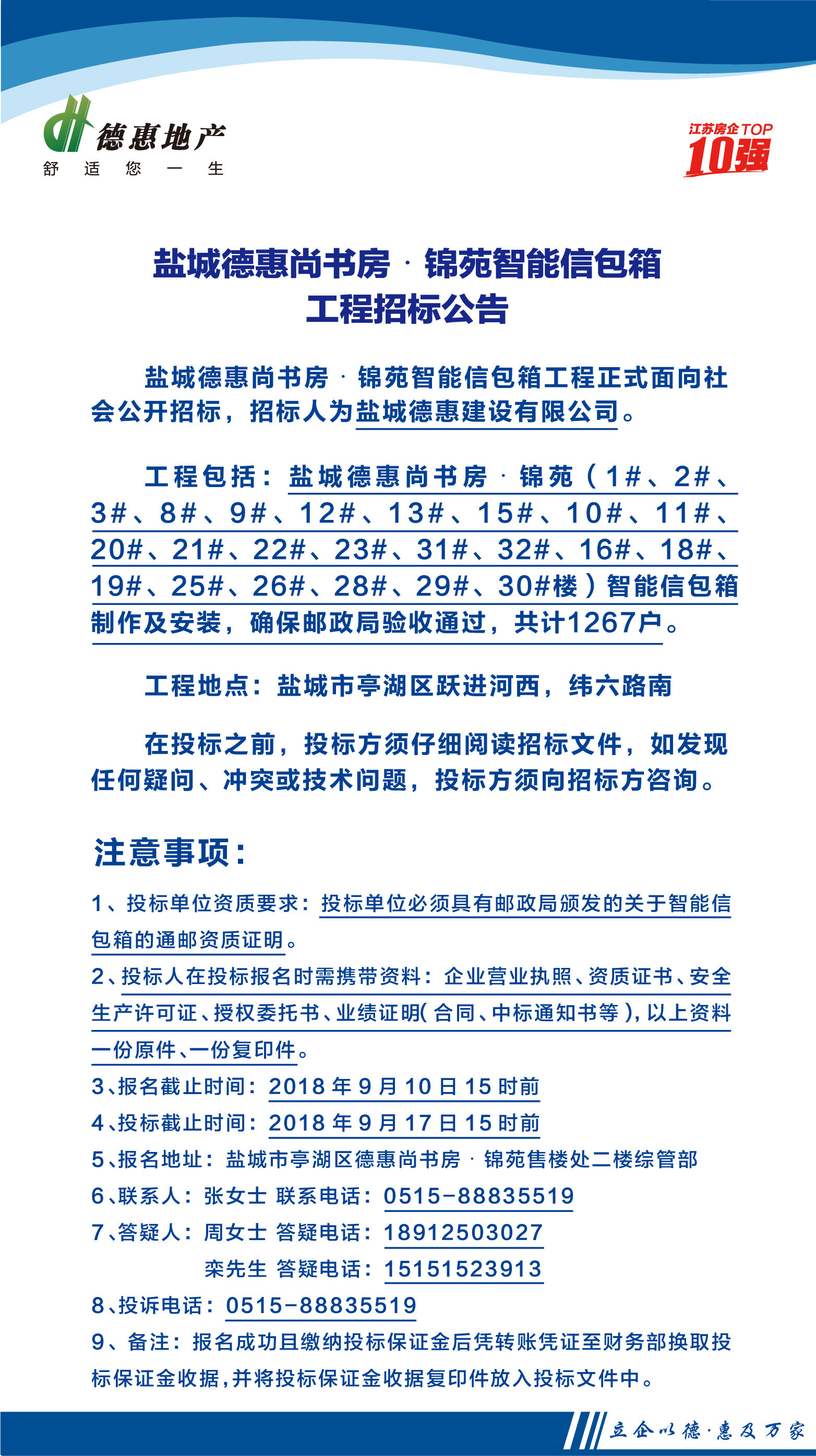 鹽城德惠尚書(shū)房•錦苑智能信包箱工程招標(biāo)公告