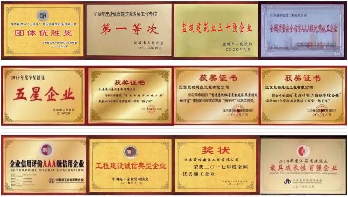 晟功建設(shè)集團(tuán)立足江蘇,面向全國(guó),承建六百余項(xiàng)工程,相繼榮獲“揚(yáng)子杯”、“玉女峰杯”、“鹽阜杯”等百余項(xiàng)榮譽(yù)。自成立以來(lái),集團(tuán)連續(xù)多年在全省免交農(nóng)民工工資保證金,被評(píng)為“全國(guó)企業(yè)社會(huì)信用評(píng)價(jià)AAA級(jí)信用企業(yè)”、“全國(guó)優(yōu)秀施工企業(yè)”、“工程建設(shè)誠(chéng)信典型企業(yè)”、“江蘇省最具成長(zhǎng)性百?gòu)?qiáng)企業(yè)”、“鹽城市建筑業(yè)發(fā)展工作先進(jìn)企業(yè)”,連續(xù)四年獲得了鹽城市“爭(zhēng)星創(chuàng)優(yōu)”星級(jí)企業(yè),名列2019年度鹽城市建筑業(yè)發(fā)展考核“第一等次”、“鹽城市建筑業(yè)30強(qiáng)”,2020年獲得江蘇省建筑產(chǎn)業(yè)現(xiàn)代化創(chuàng)新聯(lián)盟年度突出貢獻(xiàn)單位。