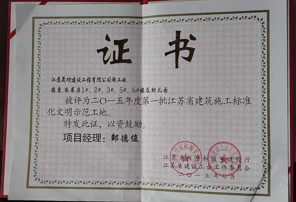 2015年10月16日,鹽城德惠尚書房東區(qū)一期工程被評為“2015年第一批江蘇省建筑施工標(biāo)準(zhǔn)化文明示范工地”!