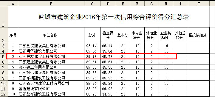 今年鹽城市城鄉(xiāng)建設(shè)局應(yīng)省建設(shè)廳要求對(duì)鹽城市內(nèi)已承接工程的建筑企業(yè)(房屋建筑施工總承包)進(jìn)行了2016年度第一次信用評(píng)價(jià),現(xiàn)得分結(jié)果已經(jīng)公示,我集團(tuán)晟功建設(shè)以總分89.78分名列三甲。