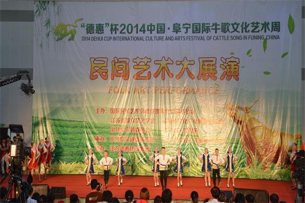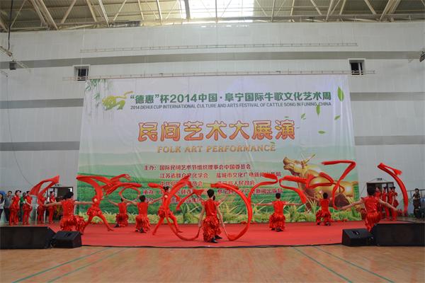 2014年5月18日,由國(guó)際民間藝術(shù)節(jié)組織理事會(huì)中國(guó)委員會(huì)、江蘇省群眾文化學(xué)會(huì)、鹽城市文化廣電新聞出版局、中共阜寧縣委員會(huì)、阜寧縣人民政府主辦,江蘇德惠集團(tuán)協(xié)辦的“德惠杯”2014中國(guó)·阜寧國(guó)際牛歌文化藝術(shù)周——民間藝術(shù)大展演在阜寧體育館圓滿落幕。