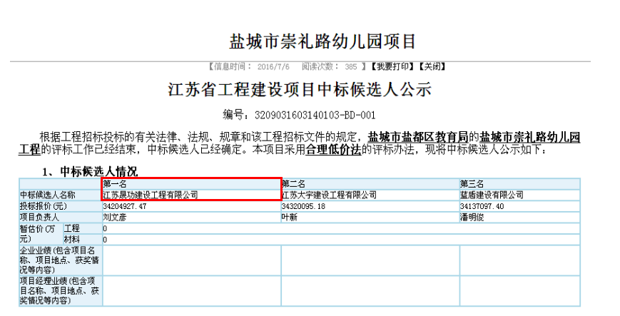 2016年7月6日,鹽城市鹽都區(qū)教育局的鹽城市崇禮路幼兒園項目中標(biāo)候選人公示,江蘇晟功建設(shè)工程有限公司以99.33分的成績位列第一名,7月12日中標(biāo)公示結(jié)果公布,晟功公司成功中標(biāo)。 本項目共計49家企業(yè)參與投標(biāo),經(jīng)過激烈競標(biāo),晟功公司憑借優(yōu)質(zhì)的品牌信用、成熟的施工經(jīng)驗(yàn)、高效的質(zhì)量進(jìn)度保證體系及合理的報價贏得了招標(biāo)單位的青睞,并順利中標(biāo)。 此次中標(biāo)標(biāo)志著晟功公司在開拓市場的道路上又前進(jìn)了一步,晟功公司將繼續(xù)朝著蘇北龍頭企業(yè)的堅定目標(biāo)而努力奮斗。 |