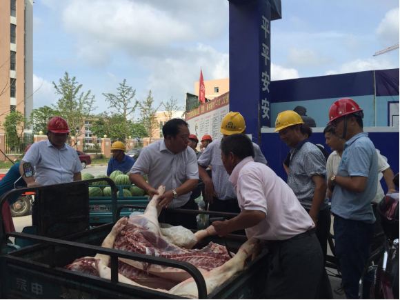 烈日炎炎,高溫持續(xù)。2016年8月4日,德惠集團(tuán)領(lǐng)導(dǎo)一行來(lái)到德惠· 尚書(shū)府項(xiàng)目施工現(xiàn)場(chǎng),慰問(wèn)工作在一線的員工們,并為他們送來(lái)了350多斤豬肉、3000多斤西瓜、80斤綠豆和40斤白糖。集團(tuán)領(lǐng)導(dǎo)詳細(xì)的了解工人們的生活作息情況,要求各負(fù)責(zé)人充分做好各項(xiàng)防暑降溫工作,保障安全生產(chǎn)。 連日來(lái),阜寧地區(qū)氣溫居高不下,連續(xù)30多度的高溫肆虐著全城。集團(tuán)公司本著“以人為本”的理念,將防暑降溫工作列入重點(diǎn),積極采取有效措施,杜絕因高溫引發(fā)的中暑或其它一切生產(chǎn)安全隱患,確保高溫期間職工的健康與安全。 本次“送清涼”深深激發(fā)了廣大職工的工作熱情,促進(jìn)了集團(tuán)公司的安全生產(chǎn),充分發(fā)揚(yáng)了德惠集團(tuán)“艱辛成就偉業(yè)、奮斗創(chuàng)造輝煌”的企業(yè)精神。希望工作在一線的廣大員工們能繼續(xù)頑強(qiáng)拼搏、迎難而上,在確保安全的基礎(chǔ)上圓滿完成工作任務(wù)。
