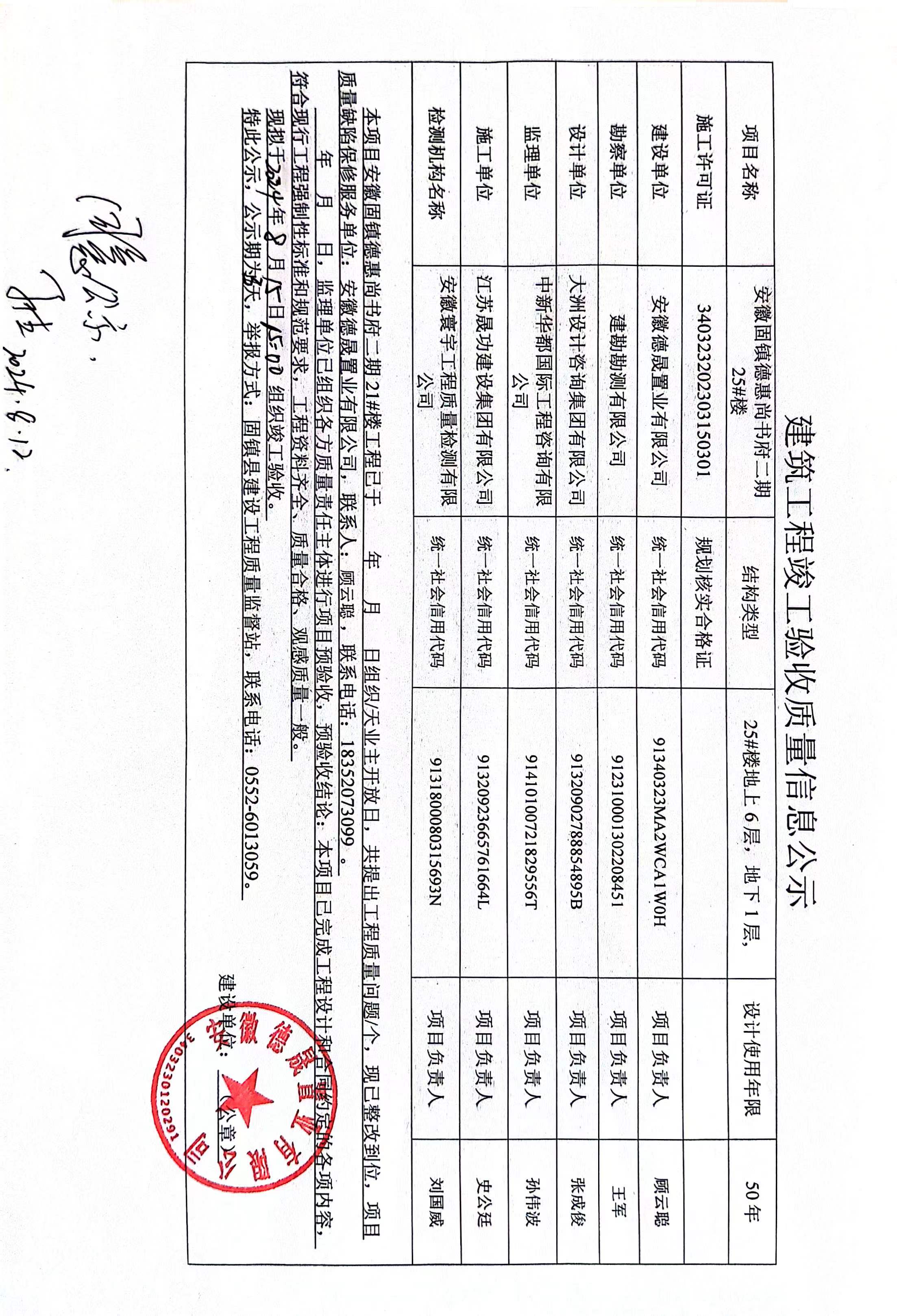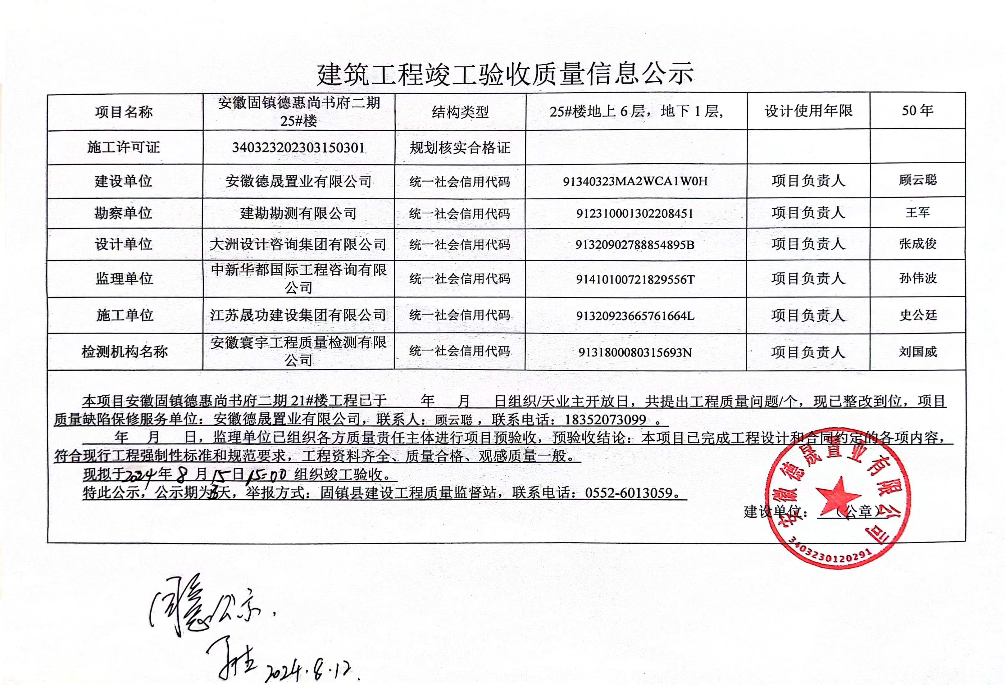 安徽固鎮(zhèn)德惠尚書府二期25#樓建筑工程竣工驗收質量信息公示