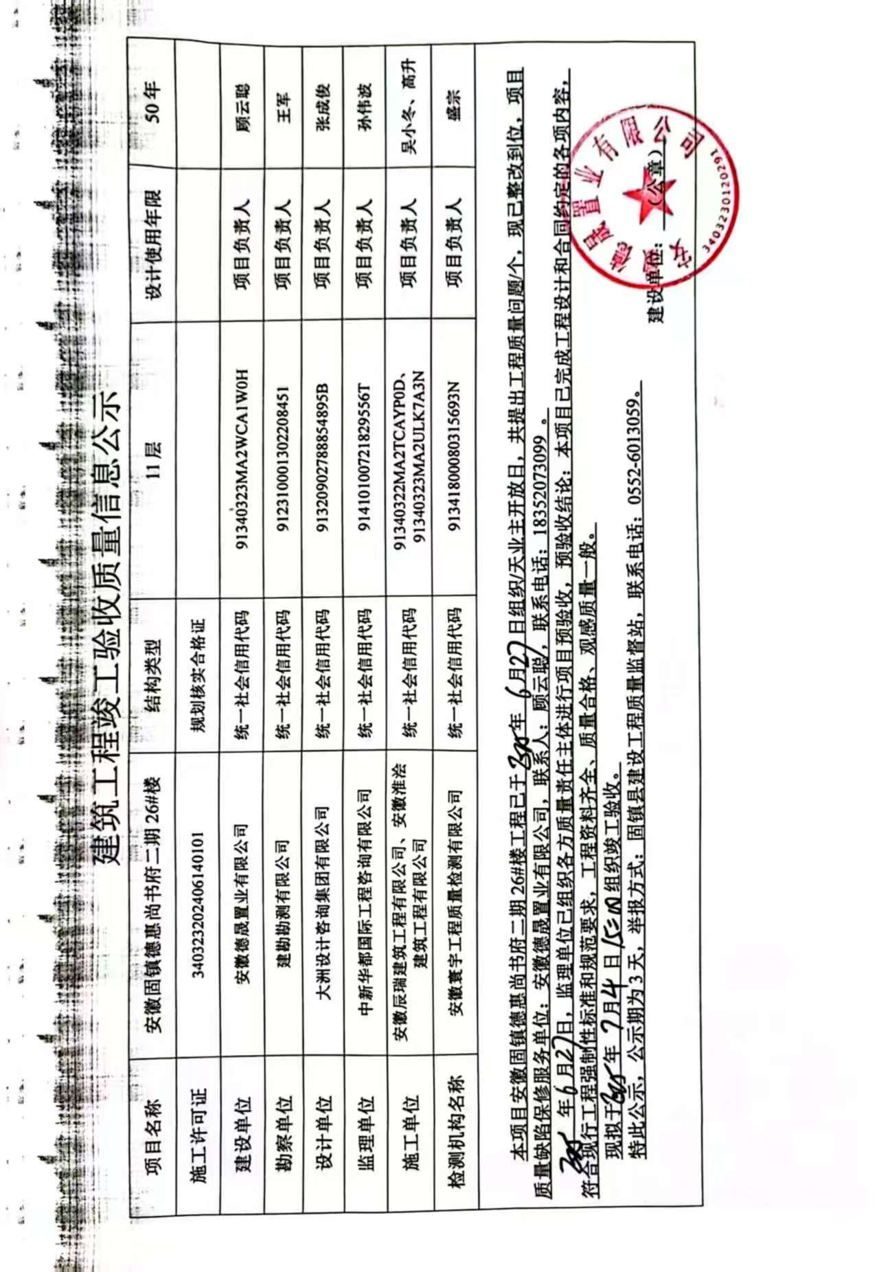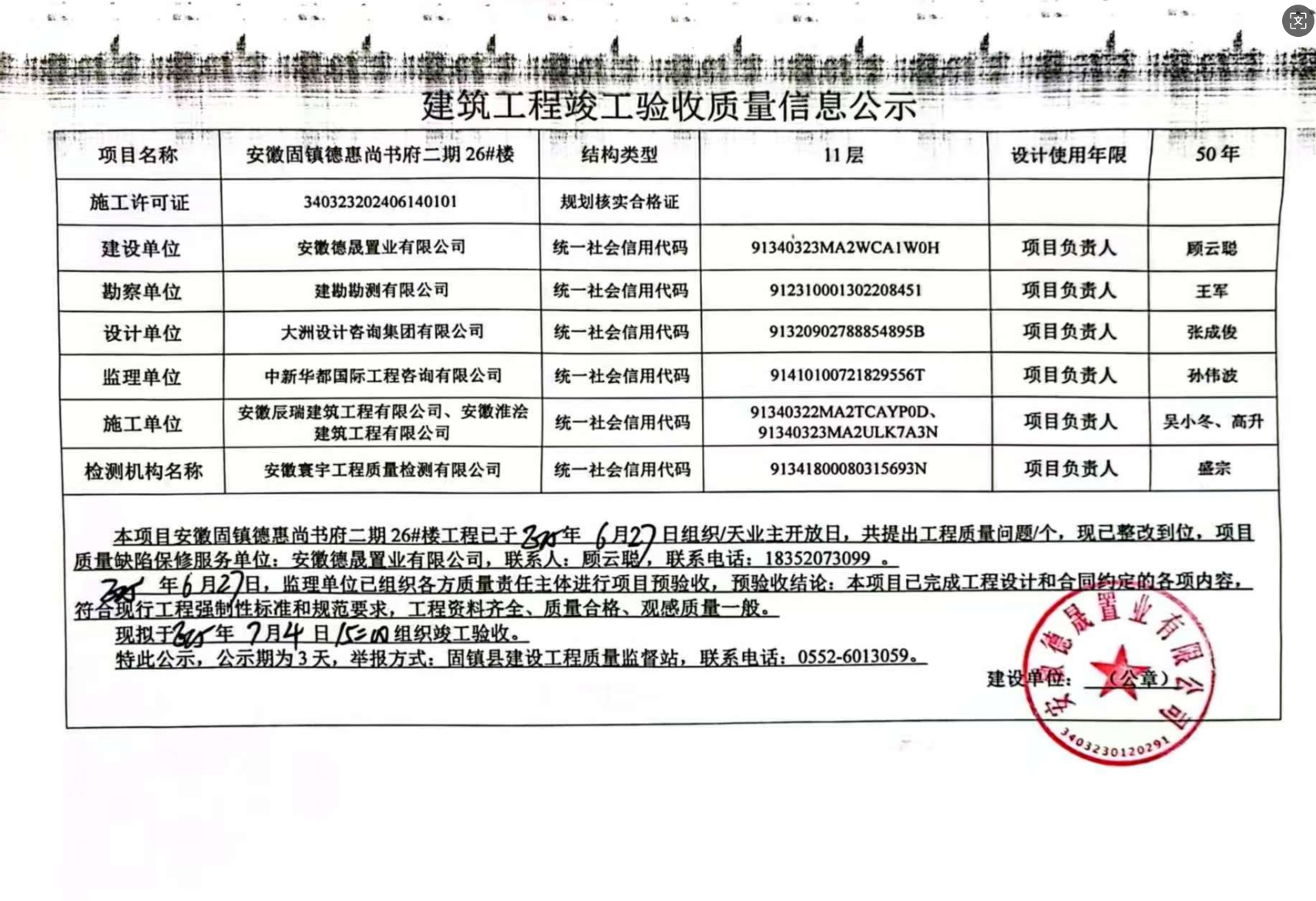 安徽固鎮(zhèn)德惠尚書府二期26#樓建筑工程竣工驗(yàn)收質(zhì)量信息公示