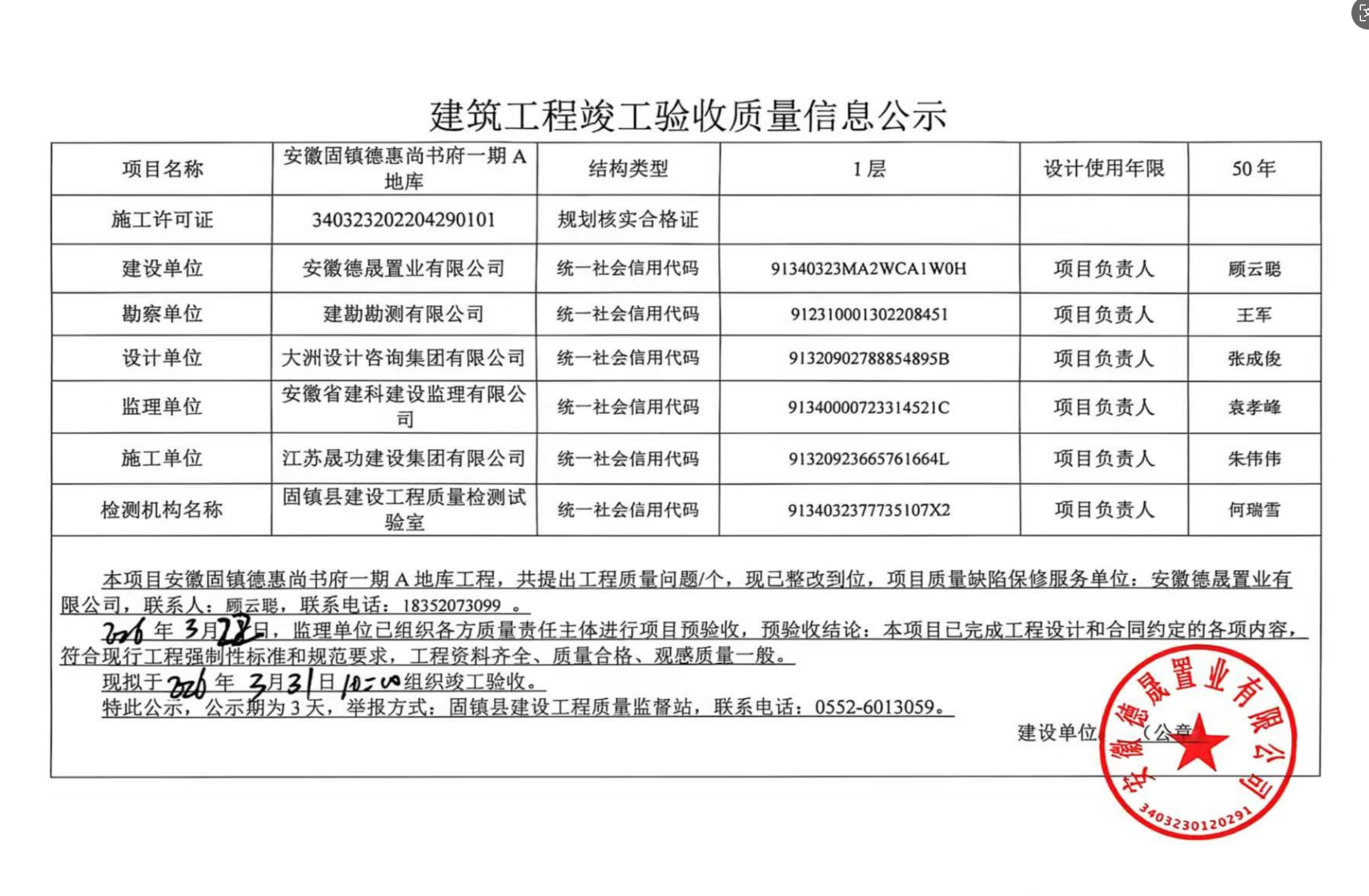 安徽固鎮(zhèn)德惠尚書府一期A地庫工程竣工驗收質(zhì)量信息公示